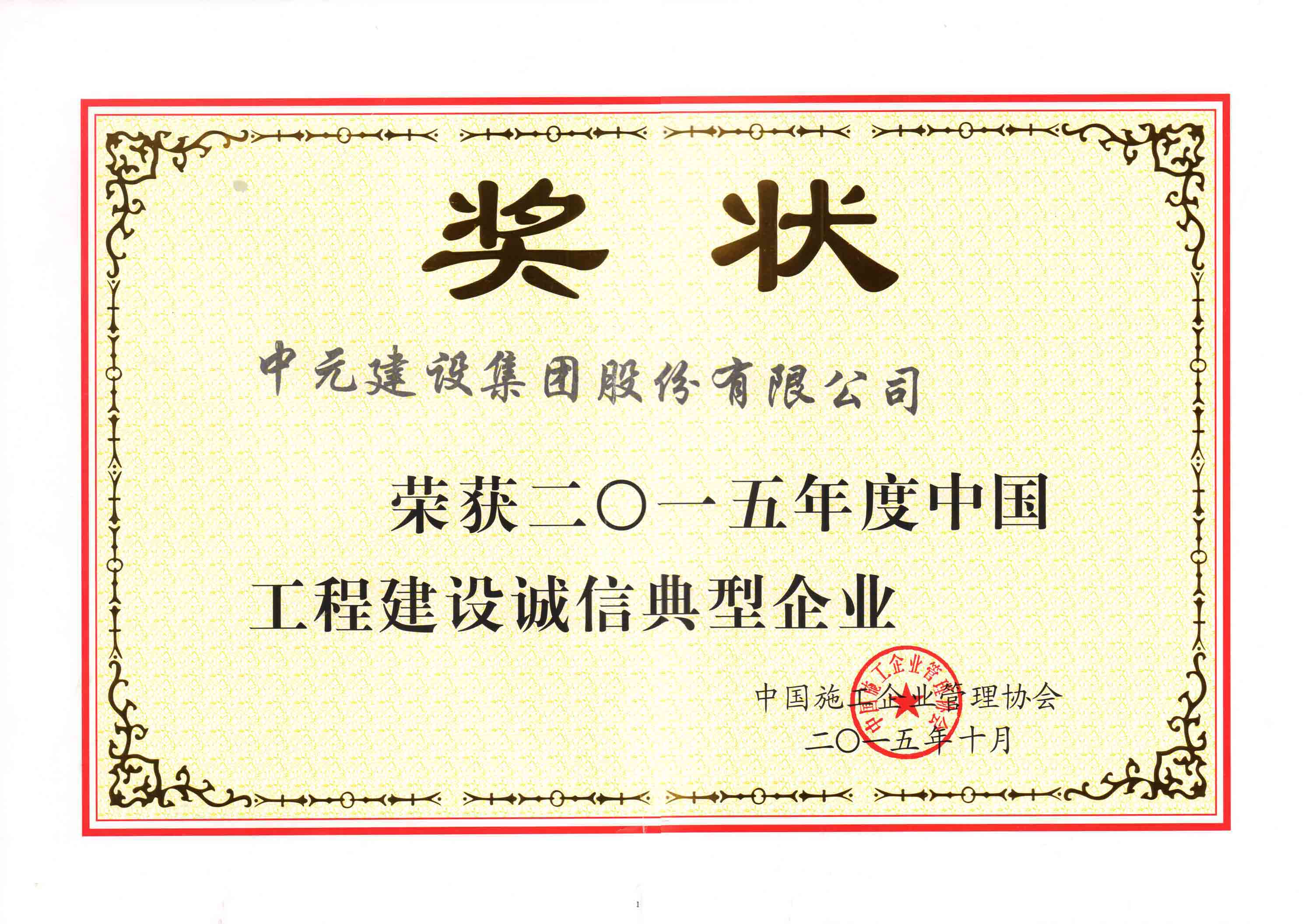 2015年度中国工程建设诚信典型企业荣誉证书