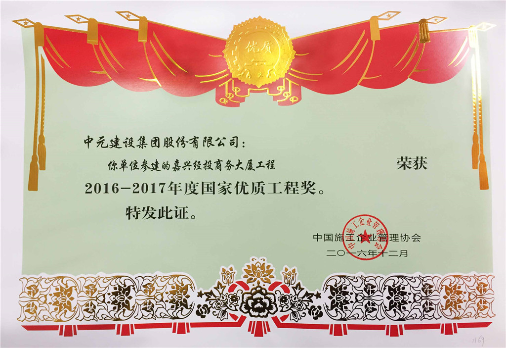 2016-2017年度第一批国家优质工程奖工程荣誉证书(嘉兴经投商务大厦工程)