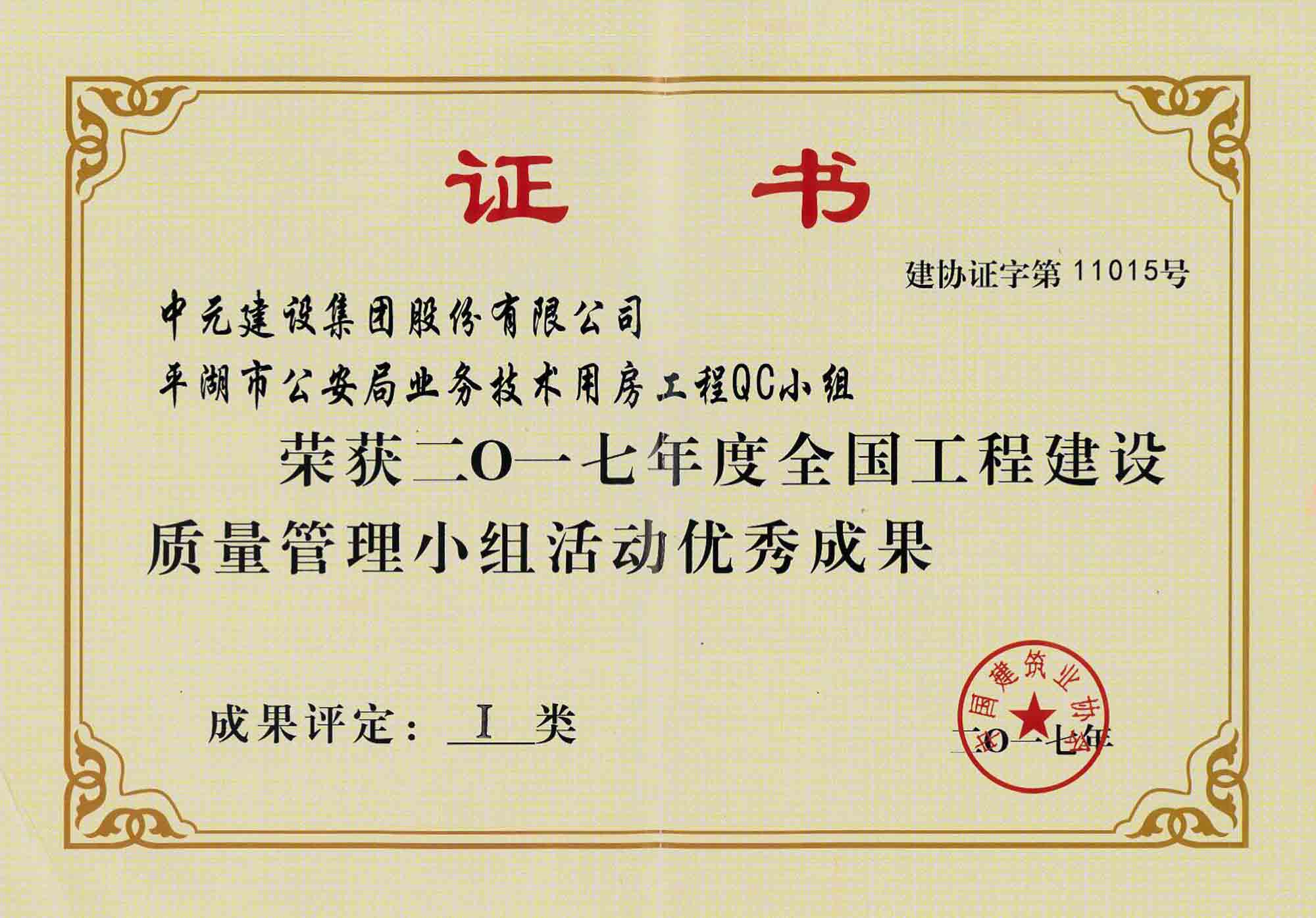 2017年全国工程建设质量管理优秀小组活动优秀成果(证书)