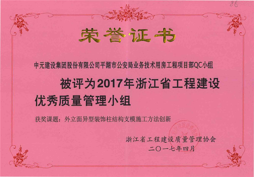 2017年浙江省工程建设优秀质量管理小组(证书)