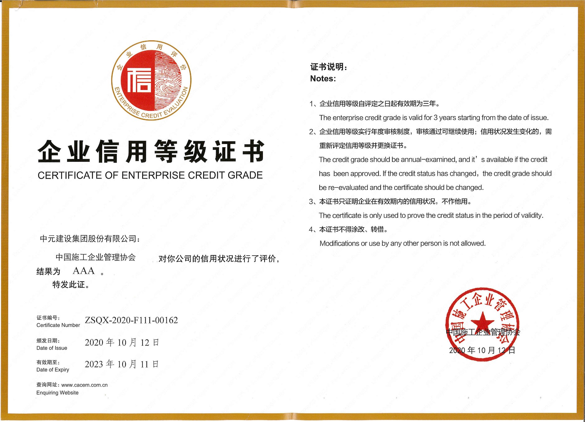 2020年度第一批工程建设企业信用评价结果(AAA)
